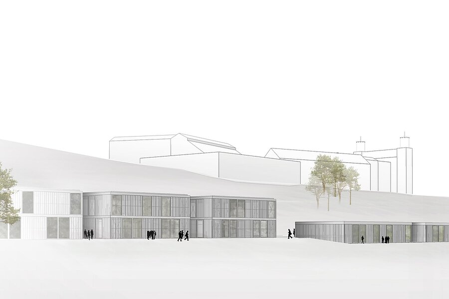 Durch die Körnung der neuen Bebauung wird eine gewisse Leichtigkeit erzeugt. Wahrgenommen werden, trotz Verbindungswegen im Hanggeschoss, fünf eigenständige Baukörper. Zwischen diesen befindet sich genügend Raum für Sichtachsen und Blickbeziehungen der Umgebung. Die einzelnen Baukörper fügen sich individuell in die Hanglage ein. Abgrabungen ringsum bilden die topografische Verbindung der Neubauten und fassen den gesamten neuen Campus zusammen.