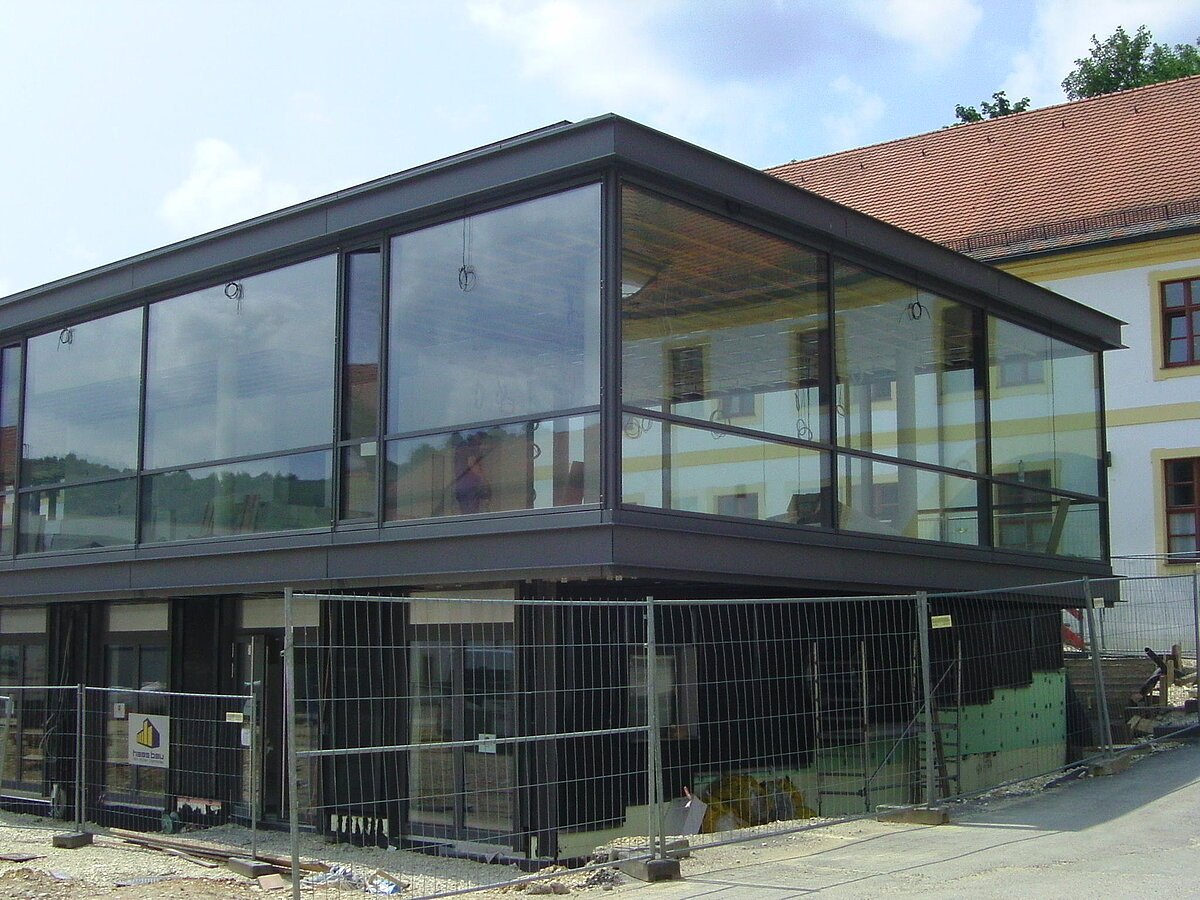 Im Kontext der historischen Klosteranlagen wurde im Innenhof in Hanglage ein transparenter Kubus errichtet.